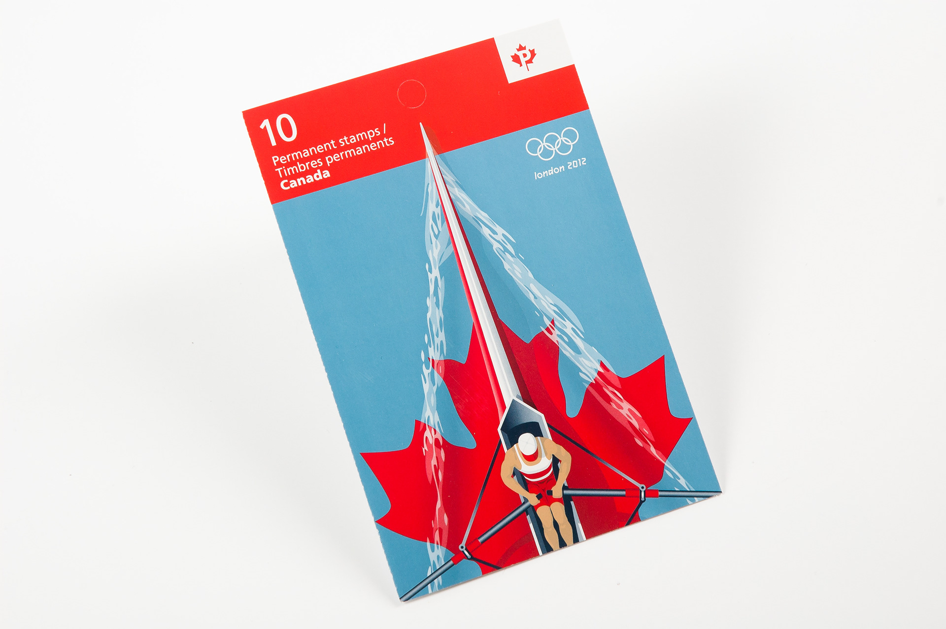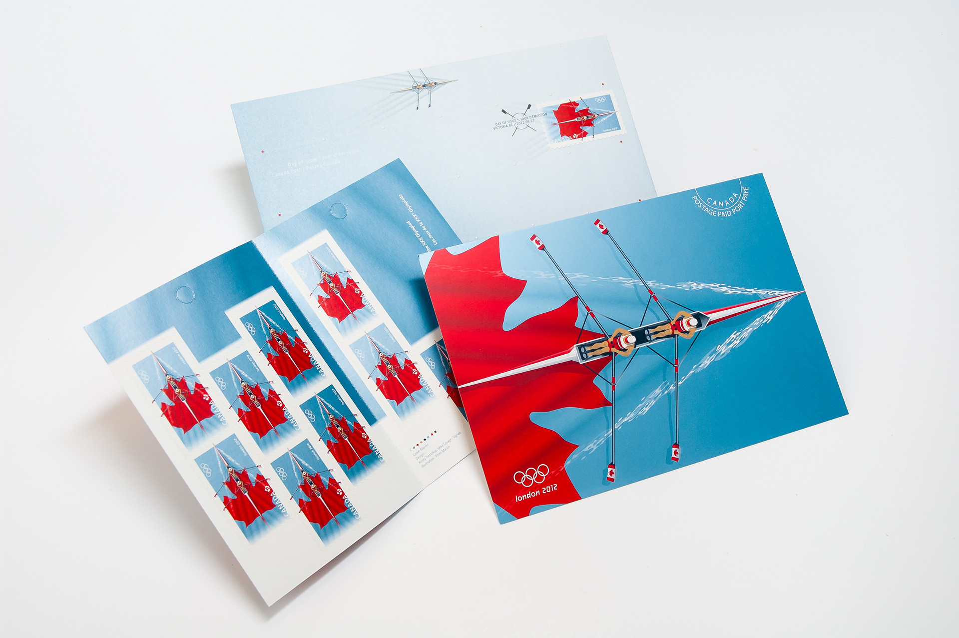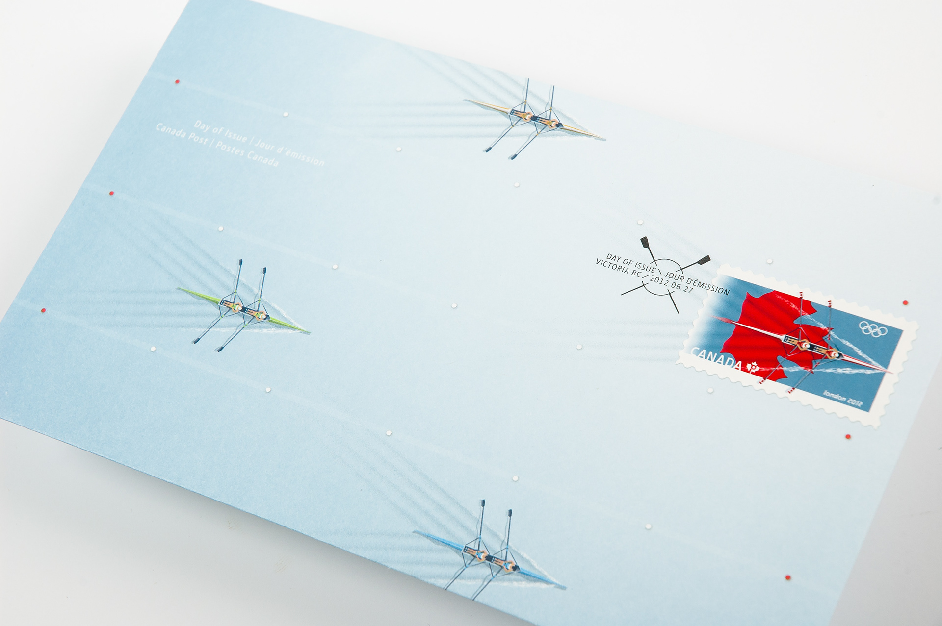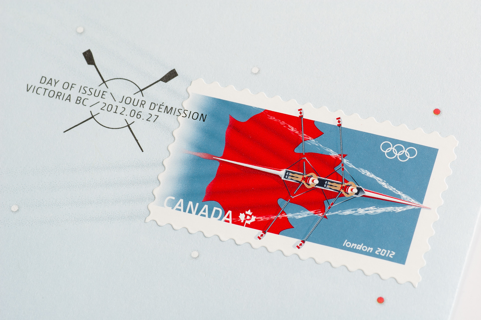 The dynamic sport of rowing was selected based on the consistent excellence displayed by the Canadian team. Designed by Kosta Tsetsekas and Mike Savage, and illustrated by Keith Martin, the stamp features a double-scull boat gliding over a sheet of water for the London 2012 Olympic Games. The boat appears to create its own wake as it moves, pushing out over the blue edge as if to show it crossing the finish line.