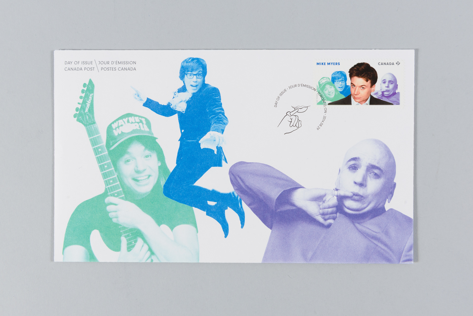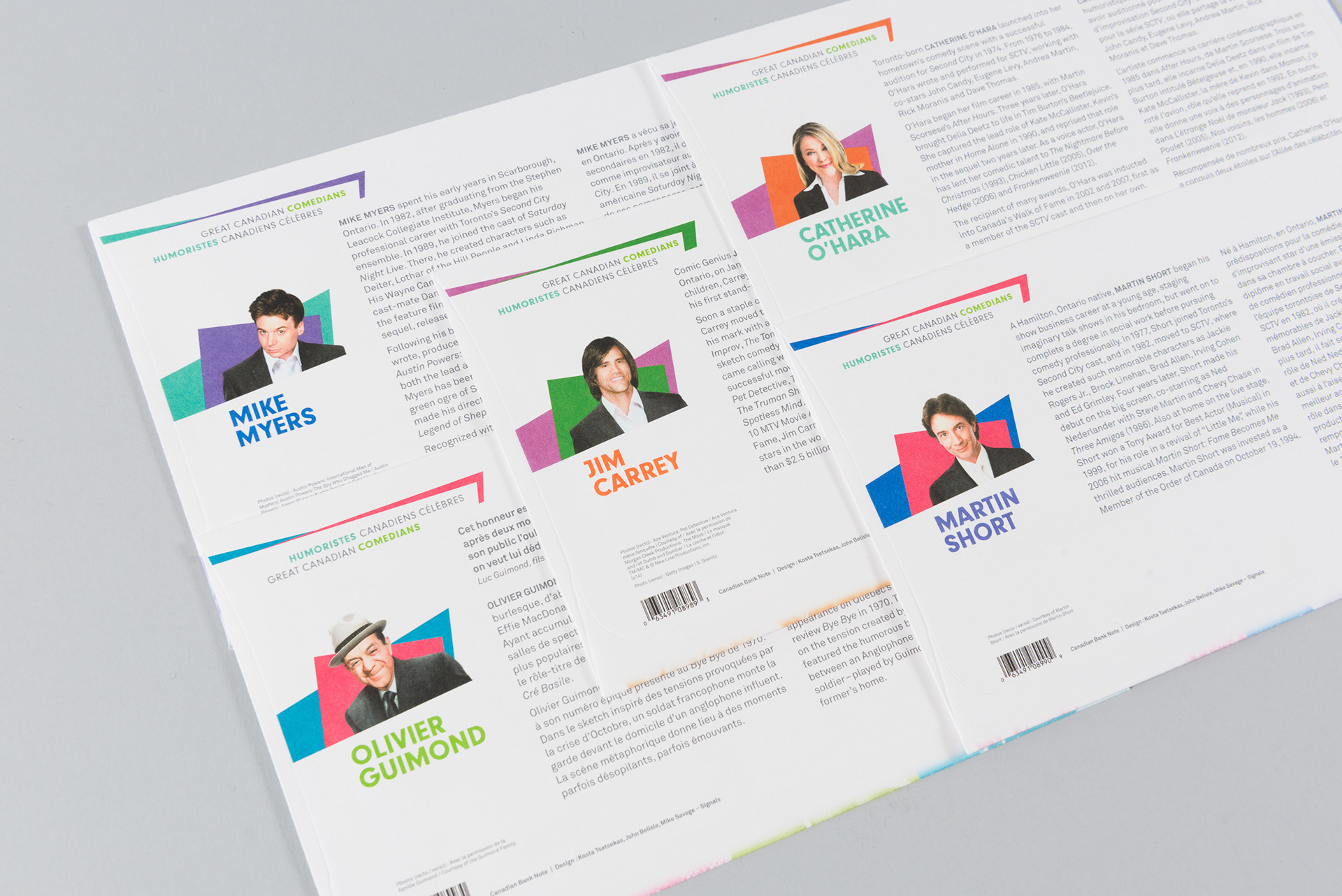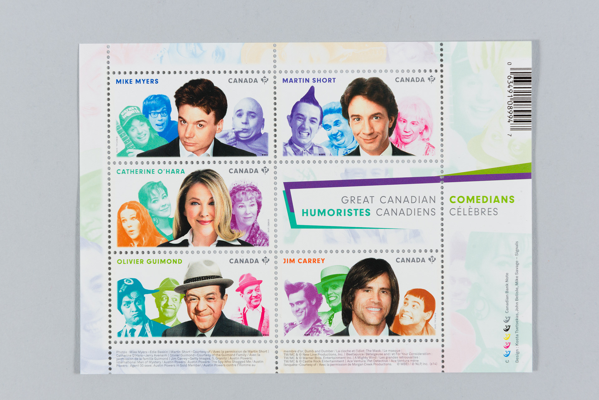 The design features a fresh, pop art feel for the stamps reflecting the comedians spirit and energy. The treatment enabled the use of a variety of image sources with varied quality, while allowing the main portrait to stand out visually and celebrate the beloved characters they brought to life. The collection includes five booklets containing a total of 50 stamps.