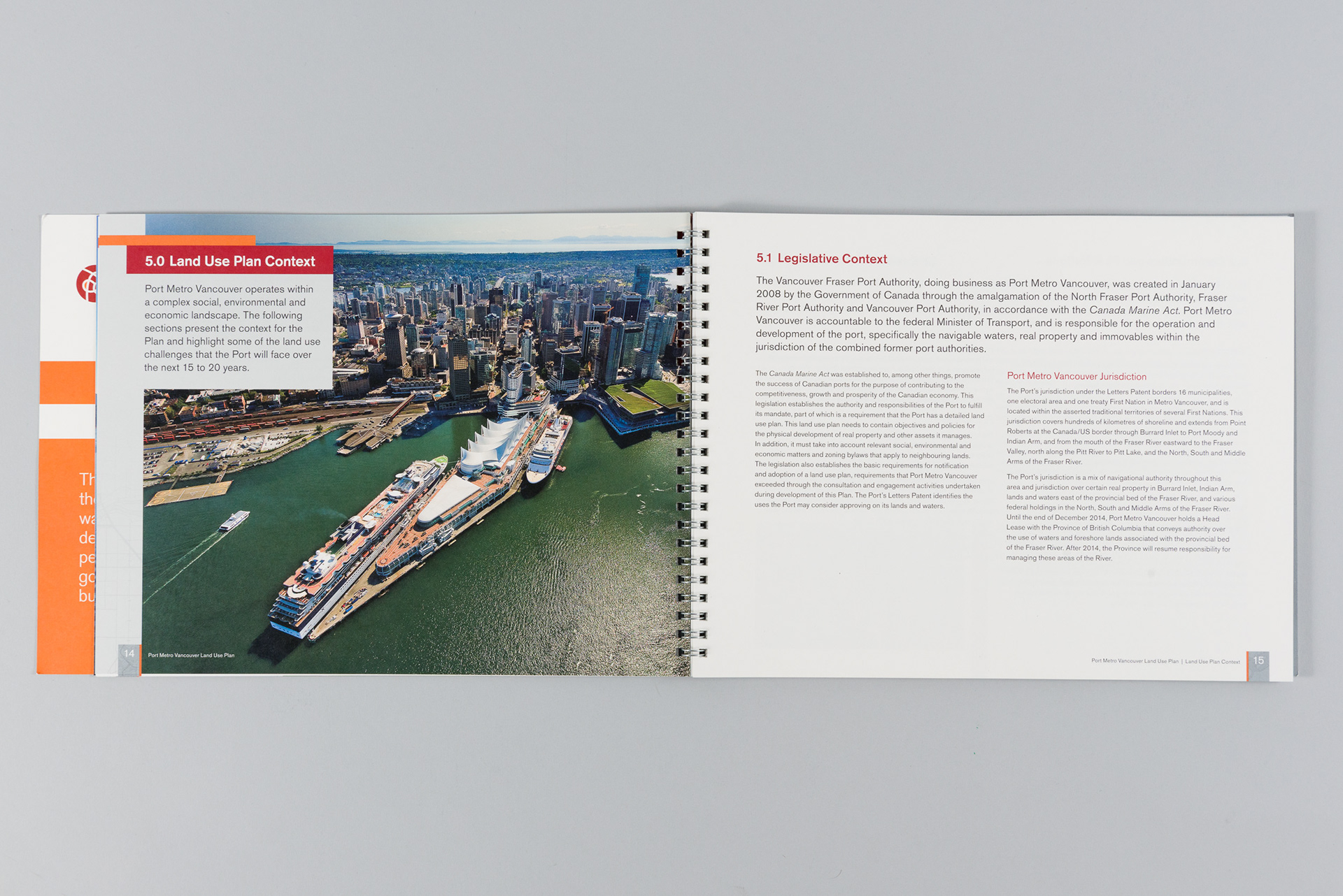 Port Metro Vancouver is Canada’s largest and most diversified port, a gateway for domestic and international trade and tourism and a major force in the Canadian economy. The Port’s biggest challenge remains balancing commercial and community interests in all their endeavours. Port Metro Vancouver’s external communications frequently deal with sensitive issues and competing priorities. With the Land Use Plan, the design challenge was to present information in a transparent, credible and balanced manner.
